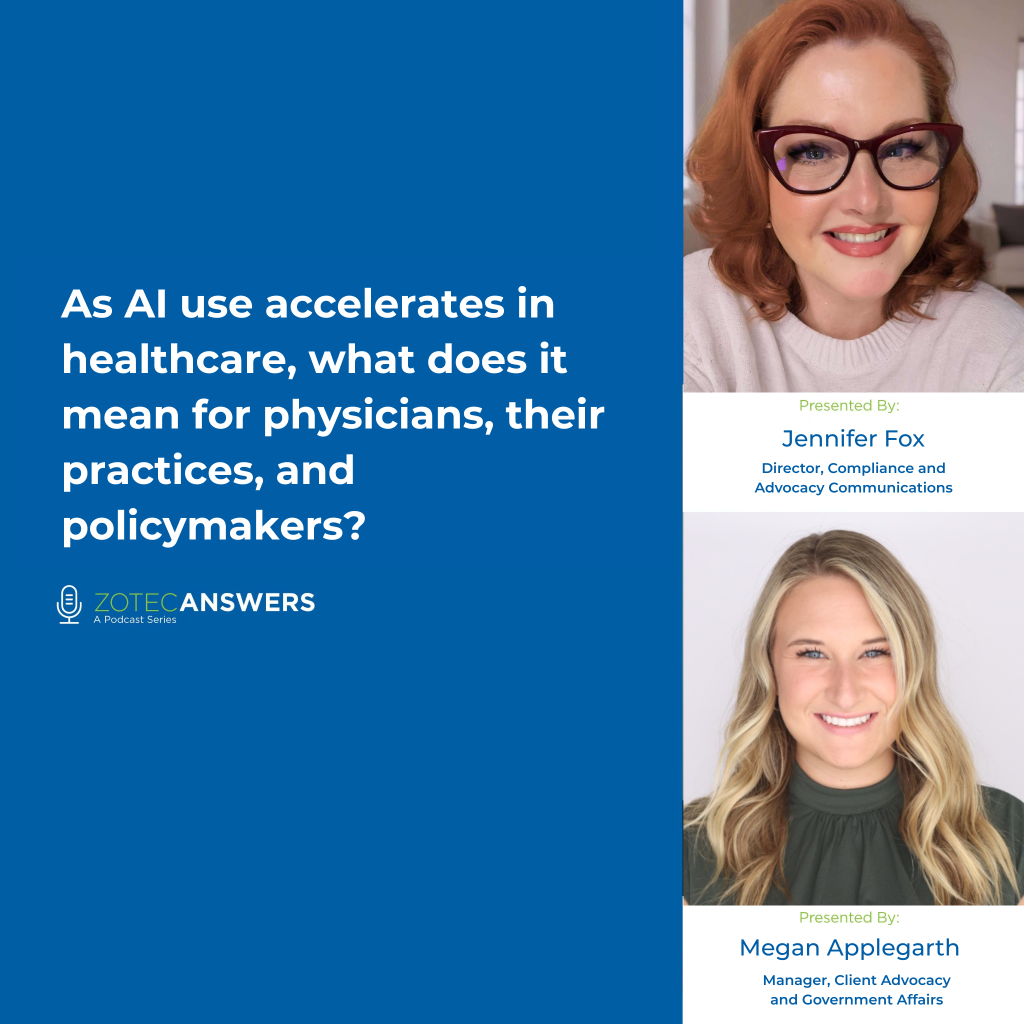 In this episode of Zotec Answers, Jennifer Fox, Director of Compliance and Advocacy Communications, is joined by Megan Applegarth, Manager of Client Advocacy and Government Affairs, to continue the AI series. They explore what comes next after adoption begins, how expectations and perspectives shift in real time, and where policy and governance stand as AI becomes more embedded in healthcare.
